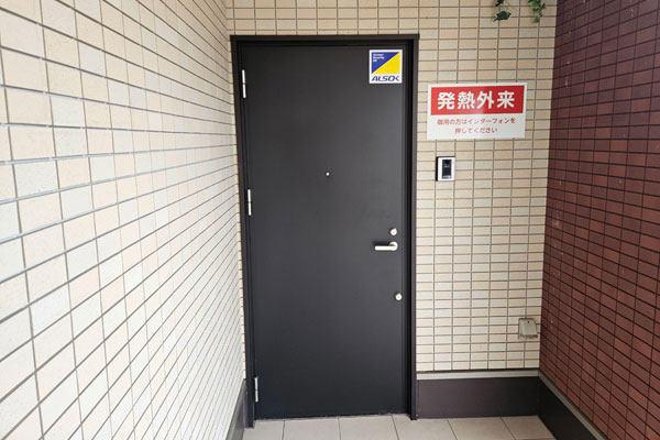 8. 発熱外来入口に着いたら「インターフォン」を押すと、鍵を開けますので待合室に入ってお待ちください。